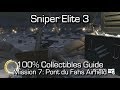 Sniper Elite 3 - 100% Collectibles Guide - Mission 7: Pont du Fahs Airfield - War Diaries, Collectible Cards, Sniper Nests, Long Shots & Weapon Upgrades Sniper Elite 3 Playlist: http://www.youtube.com/playlist?list=... Subscribe: https://www.youtube.com/channel/UCZoj... [0:10] - Weapon Upgrade #1 [1:36] - Sniper Nest #1 [1:48] - War Diary #1 [2:19] - Sniper Nest #2 [2:31] - Collectibles Cards #1 [2:56] - Collectibles Cards #2 [3:25] - Weapon Upgrade #2 [4:11] - War Diary #2 [4:19] - War Diary #3 [4:54] - Sniper Nest #3 [5:05] - Long Shot #1 [5:35] - Collectibles Cards #3 [5:53] - War Diary #4 [6:13] - War Diary #5 [6:34] - War Diary #6 [6:54] - War Diary #7 [7:18] - War Diary #8 [7:50] - War Diary #9 -------------- Casual Reader Find half of the war diaries Archivist Find all the war diaries The gathering Find all the collectible cards Nesting instinct Find all the Sniper nests A shot in the dark Complete all the long shots Nothing is optional Complete all the optional objectives Dedicated soldier Complete 100% of the campaign on any difficulty You'll try anything once Play 1 mission in each mode (campaign, challenges, competitive multiplayer) Ghost of Tobruk Clear the mountain pass without alerting the enemy (Mission 1) Well, well, well Hide a body in each of the wells in Gaberoun (Mission 2) End of the 'lein' Found and killed the visiting General (Mission 3) I Fort this would be difficult Get to the informant without being spotted (Mission 4) I Siwa you did there Made the target officer's death look like an accident (Mission 5) Double tap Incapacitate 2 vehicles in Kasserine Pass within 5 seconds (Mission 6) Three birds, one stone Destroyed all 3 bomb dumps at the same time (Mission 7) Long way down Thrown an enemy off one of the bridges (Mission 8) Through the looking glass Kill 10 snipers before they see/shoot you Hidden and dangerous Complete a campaign mission without being seen (excluding Tobruk) A few of my favourite things Get a kill with each offensive item Double the distance Snipe enemies over a cumulative distance of a double marathon Conserving oxygen Hold breath for one hour Indestructible Complete a mission after losing over 500 units of health Charlie's Challenge Get a testicle-shot from over 100m away